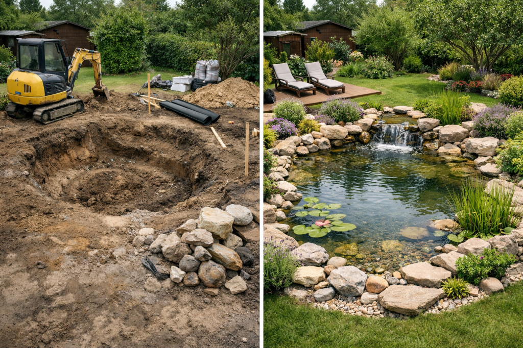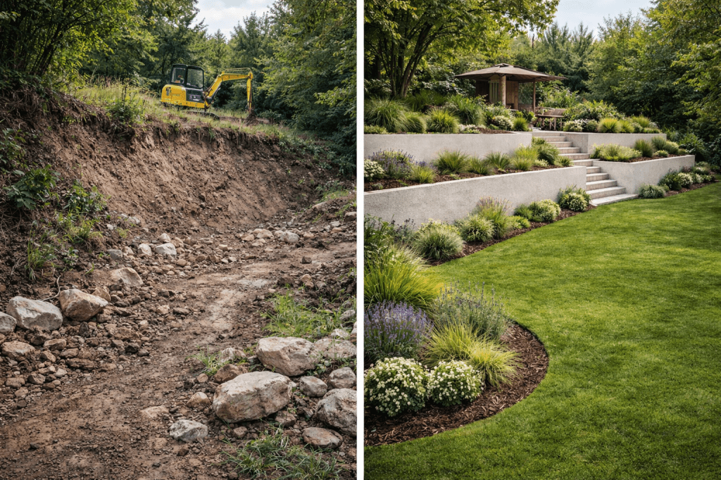 Création d’un bassin paysager avec cascade naturelle. Du terrassement brut à un véritable coin de détente au cœur du jardin 🌿💧Création de restanques, nivellement du terrain et aménagement paysager complet pour transformer un talus brut en jardin structuré, élégant et parfaitement accessible 🌿Débroussaillage et remise en état d’un terrain envahi par la végétation, transformé en espace propre et prêt à être aménagé