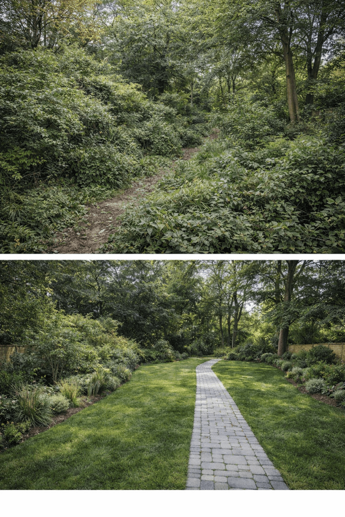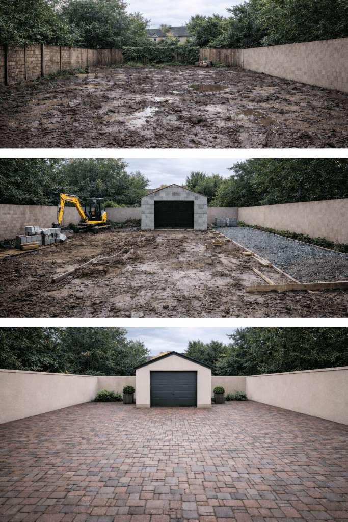 Création d’un chemin paysager et réaménagement complet du jardin, pour transformer un passage sauvage en allée élégante et accessible, parfaitement intégrée à la natureTransformation complète d’une cour boueuse en une allée et un espace de stationnement en pavés, avec terrassement, fondations, nivellement et finitions soignées pour un rendu propre, durable et esthétique.