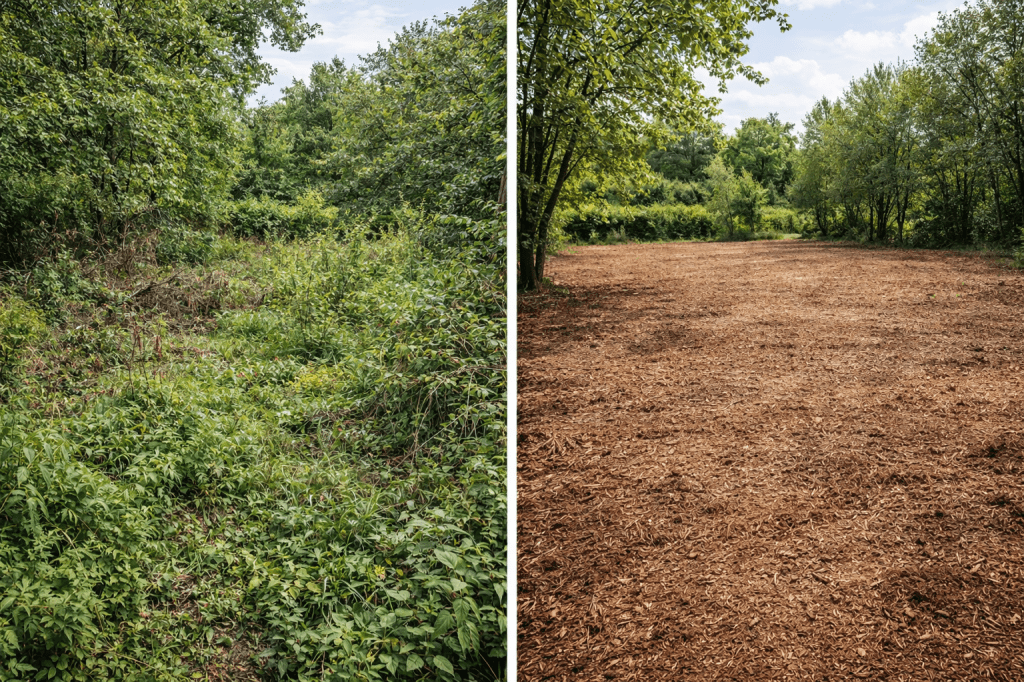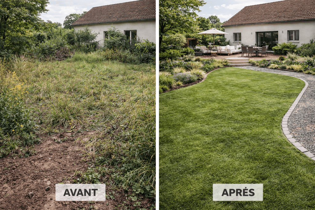 Reprise complète du terrain avec débroussaillage, nivellement, création de massifs, pose de bordures et engazonnement pour transformer un jardin en friche en un espace vert harmonieux et prêt à vivre.